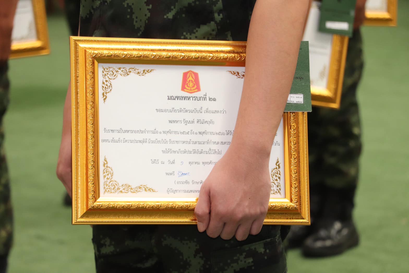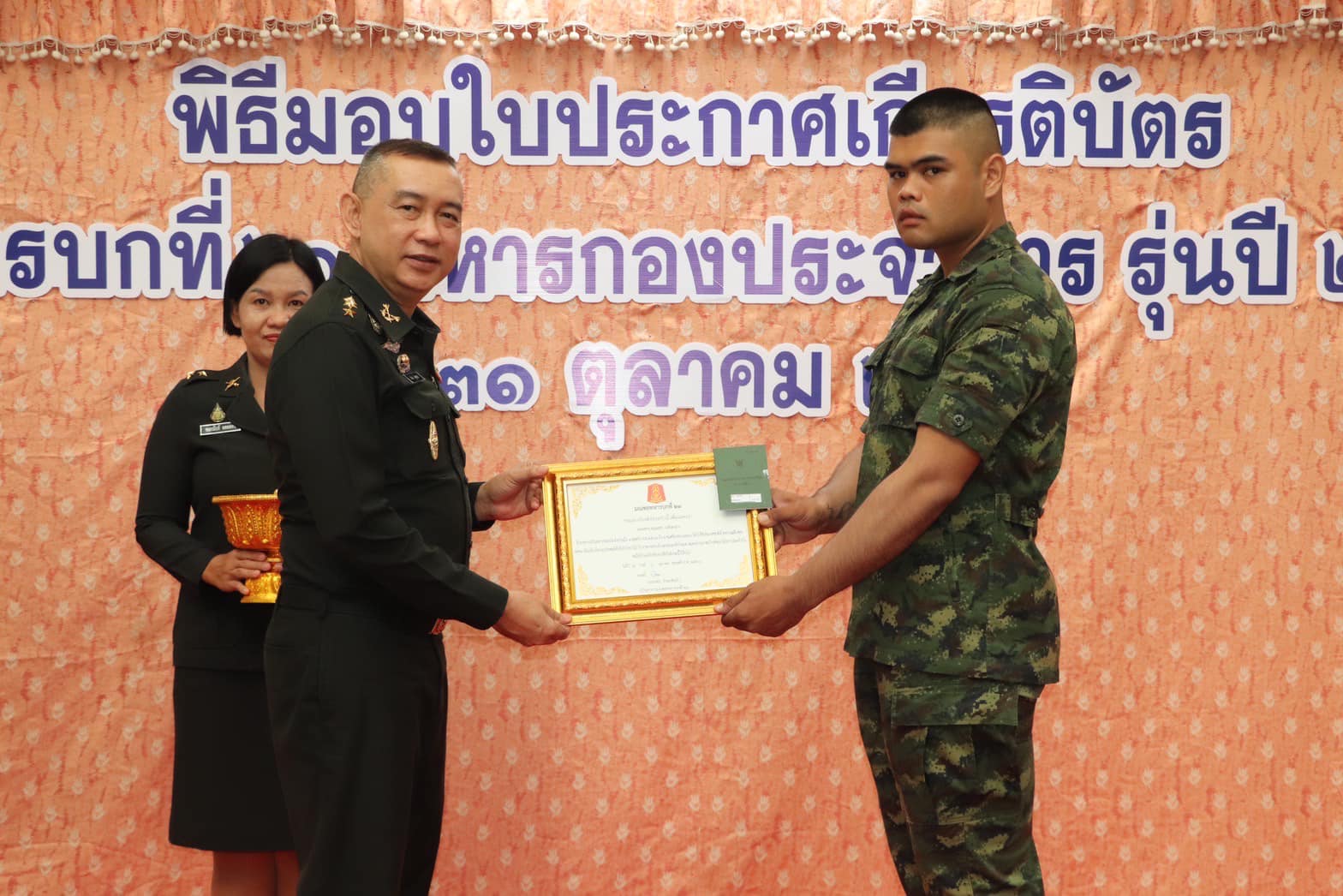 เมื่อวันที่ 31 ต.ค.66 เวลา 0900 พ.อ.สาธิต อุ่นกาย รอง ผบ.มทบ.21(1) เป็นผู้แทน ผบ.มทบ.21 ได้กระทำพิธีมอบใบประกาศเกียรติคุณพร้อมกับสมุด สด.8 ให้กับพลทหารกองประจำการ รุ่น 2564 ผลัดที่ 2 ที่จะปลดประจำการเป็นทหารกองหนุนในวันที่ 1 พ.ย.66 นี้ จำนวน 21 นาย การมอบใบประกาศเกียรติคุณในครั้งนี้เพื่อแสดงว่าน้อง ๆ ได้เสียสละในการปฏิบัติหน้าที่เพื่อกองทัพบก ตลอดจนประเทศชาติ ซึ่งตลอดระยะเวลาที่รับราชการเป็นทหารกองประจำการ หน่วยได้ทำการฝึกให้มีความอดทน มีความรู้ในวิชาทหารทั่วไป วิชาทหารช่าง ตลอดจนวิชาชีพที่น้อง ๆ เลือกศึกษาตามความสามารถที่น้อง ๆ ถนัด ซึ่งนับว่าเป็นประโยชน์ต่อการประกอบอาชีพได้ในอนาคต หน่วย ขอขอบคุณ ที่น้อง ๆ ได้ตั้งใจในการปฏิบัติงานทุกภารกิจที่ได้รับมอบหมาย ได้เป็นอย่างดีเยี่ยม เพื่อชาติ ศาสน์ กษัตริย์ และประชาชน เสมอมา ณ บก.มทบ.21