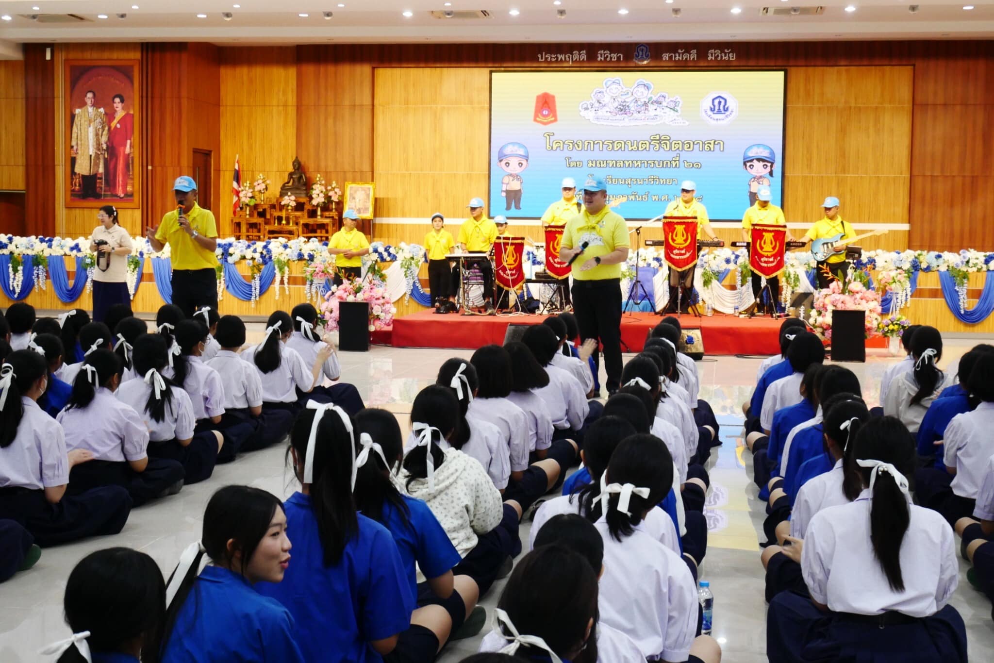 เมื่อวันที่ 24 ก.พ.68 เวลา 1000 - 1100 : พล.ต.อรรถชัย รักษาศิลป์ ผบ.มทบ.21/ผอ.ศอ.จอส.พระราชทาน มทบ.21 พ.อ พงษ์กฤษฏ์ รุจิโยธิน รอง ผบ.มทบ.21/รอง ผอ.รมน.จังหวัด น.ม. ร่วมกิจกรรม "โครงการดนตรีจิตอาสา โดย มณฑลทหารบกที่ 21" ณ ร.ร.สุรนารีวิทยา โดยมี นายธนวัฒน์ สุขเกษม ผอ.ร.ร.สุรนารีวิทยา ให้การต้อนรับ โดยได้พบปะนักเรียนที่เข้าร่วมกิจกรรม ให้แนวทางในการศึกษาเล่าเรียน การให้ความสำคัญกับสถาบันหลักของชาติ ซึ่งประกอบด้วย ชาติ ศาสนา พระมหากษัตริย์ และการเป็นผู้มีจิตสาธารณะ ช่วยเหลือผู้อื่น ในลักษณะจิตอาสา ในกิจกรรม เป็นการนำวิทยากร ชป.กร.มทบ.21, วงดนตรี มว.ดย.มทบ.21 จัดกิจกรรมและบรรเลงดนตรี เพื่อสร้างความบันเทิง ลดความเครียด จากการเรียน สร้างภูมิคุ้มกันทางสังคม และ สร้างจิตสำนึกการมีจิตอาสา โดยมีผู้ร่วมกิจกรรมเป็นนักเรียนชั้นมัธยมศึกษา ปีที่ 4 จำนวน 500 คน
