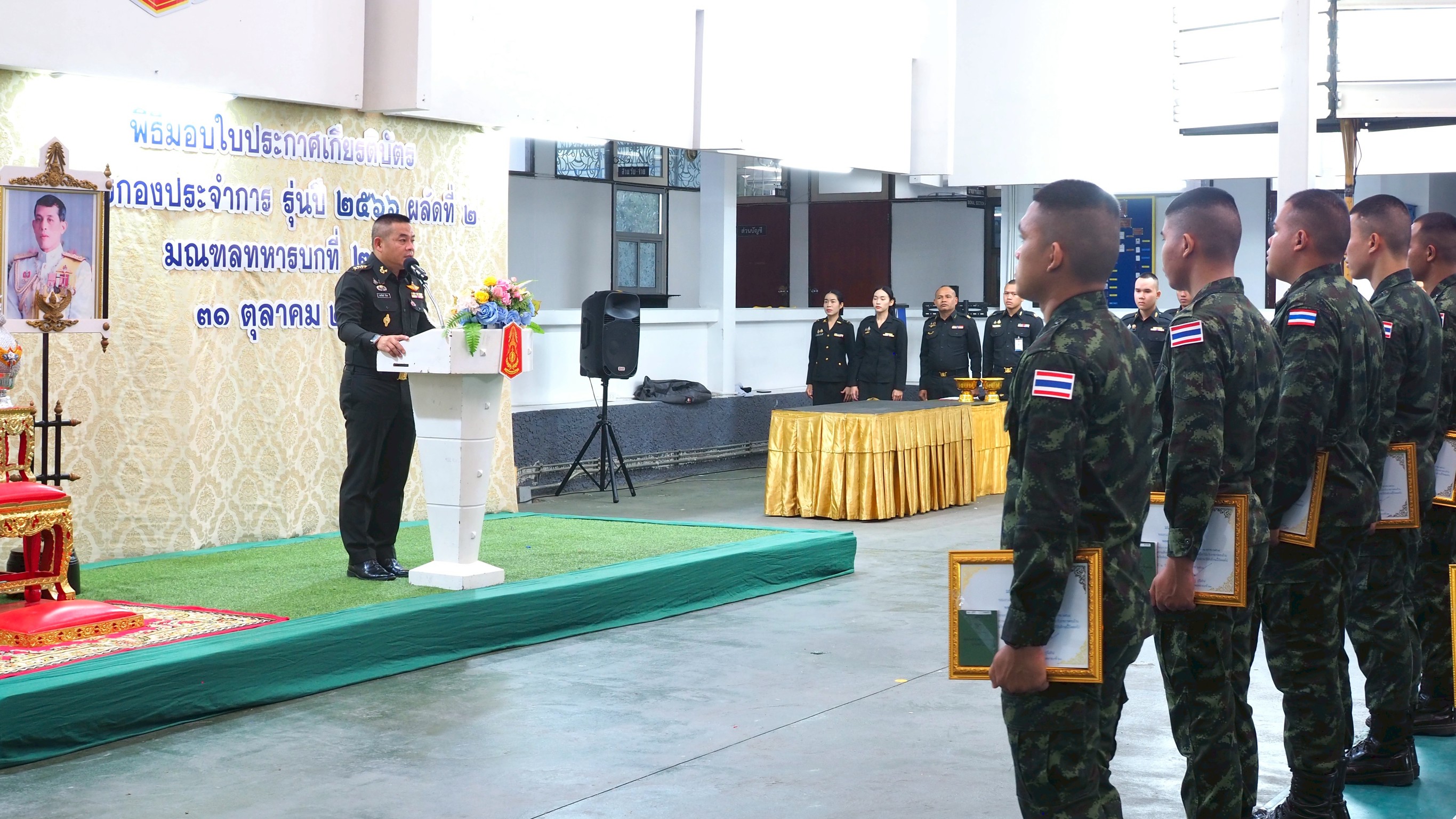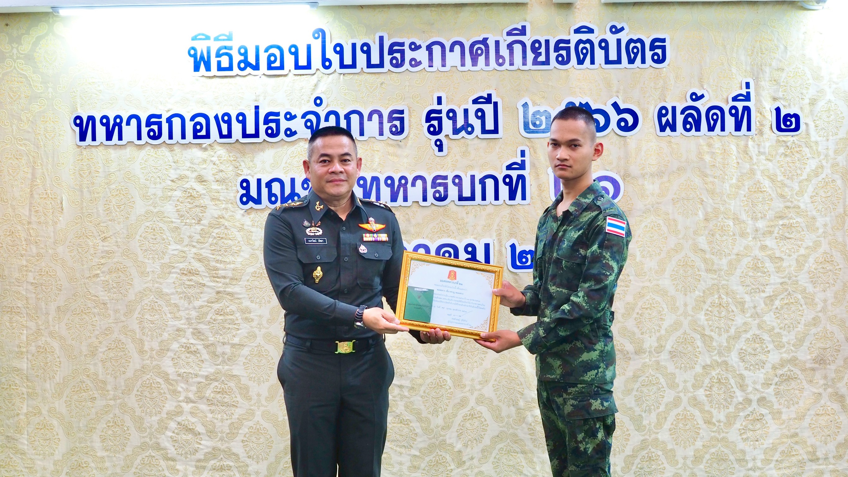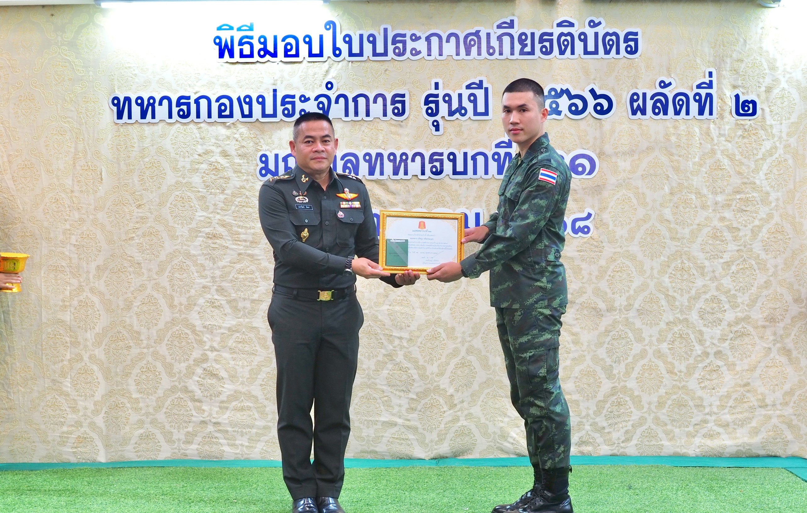 (31 ต.ค. 68 เวลา 0900) ที่กองบัญชาการมณฑลทหารบกที่ 21 จัดพิธีมอบใบประกาศเกียรติบัตร และสมุดประจำตัวทหารกองหนุนประเภทที่ 1 (สด.8) ให้กับทหารกองประจำการุ่นปี 2566 ผลัดที่ 2 สังกัด กองบัญชาการมณฑลทหารบกที่ 21 ที่ครบกำหนดปลดเป็นทหารกองหนุนใน 1 พฤศจิกายน พุทธศักราช 2568 จำนวน 25 นาย ที่ได้เสียสละทุ่มเทแรงกายแรงใจ เข้ามารับใช้ชาติ สมความภาคภูมิของลูกผู้ชายไทย ร่วมกันปฏิบัติหน้าที่ และพัฒนาหน่วยด้วยดีตลอดมา ทำให้ภารกิจที่หน่วยได้รับมอบหมาย สําเร็จลุล่วงด้วยดี โดยมี พันเอก อมรวัฒน์ มัจฉา รองผู้บัญชาการมณฑลทหารบกที่ 21 เป็นผู้แทน ผู้บัญชาการมณฑลทหารบกที่ 21 เป็นประธานในพิธี ซึ่งได้ฝากให้น้องๆ นำความรู้ และประสบการณ์ในช่วงที่รับราชการ ไปใช้ให้เกิดประโยชน์ อาทิ ความมีระเบียบ มีวินัย จิตอาสา นำไปปฏิบัติ เพื่อพัฒนาตัวเอง พัฒนาสังคม และพัฒนาประเทศชาติ ให้มีความเจริญมั่นคง และเป็นพลเมืองที่ดีต่อไป